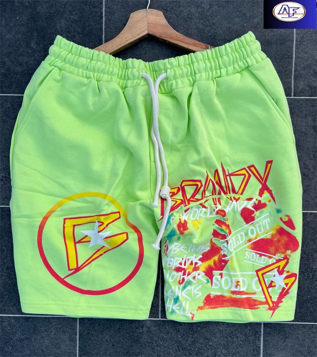 Découvrez ces shorts stylés vert fluo avec motif graffiti. Parfaits pour un look d'été audacieux et tendance, confortables et ultra-modernes. Idéal pour les sorties décontractées ou les journées actives.