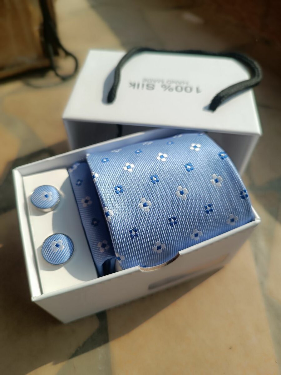 Elevate your style with this 100% silk tie and cufflink set, perfect for business and formal events. Handcrafted with exquisite patterns, it adds a touch of sophistication and class to any outfit. Ideal for gentlemen who appreciate quality and elegance.