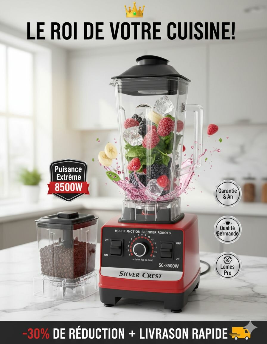 Découvrez le blender multifonction Silver Crest SC-8500W, puissant 8500W, avec 2 bols incassables et 8 lames en acier inoxydable. Idéal pour mixer, hacher et préparer vos boissons et recettes en toute simplicité. Utilisation professionnelle garantie !