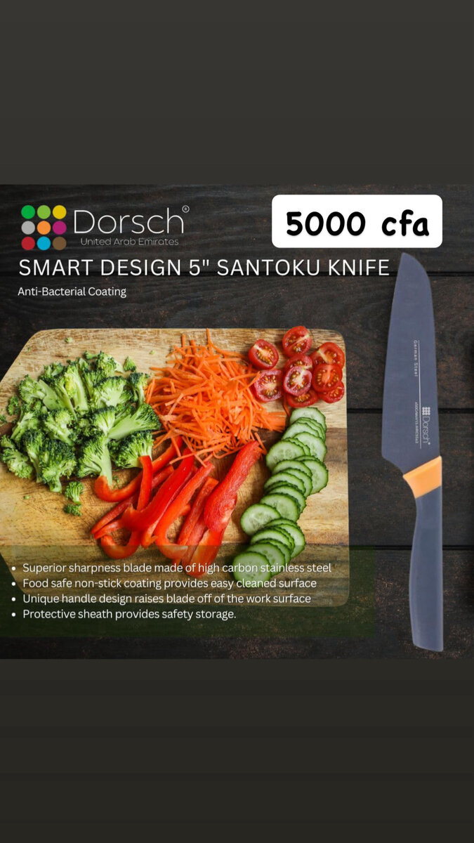 سكين سانتوكو 5 بوصة بتصميم ذكي وطلاء مضاد للبكتيريا لقطع مثالي. مثالي لمحبي الطهي ويتميز بشفرة حادة من الفولاذ عالي الكربون. يوفر مقبض فريد راحة ودقة عالية أثناء الاستخدام. يأتي مع غمد حماية للتخزين الآمن. اختيار مثالي للمطبخ العصري.
