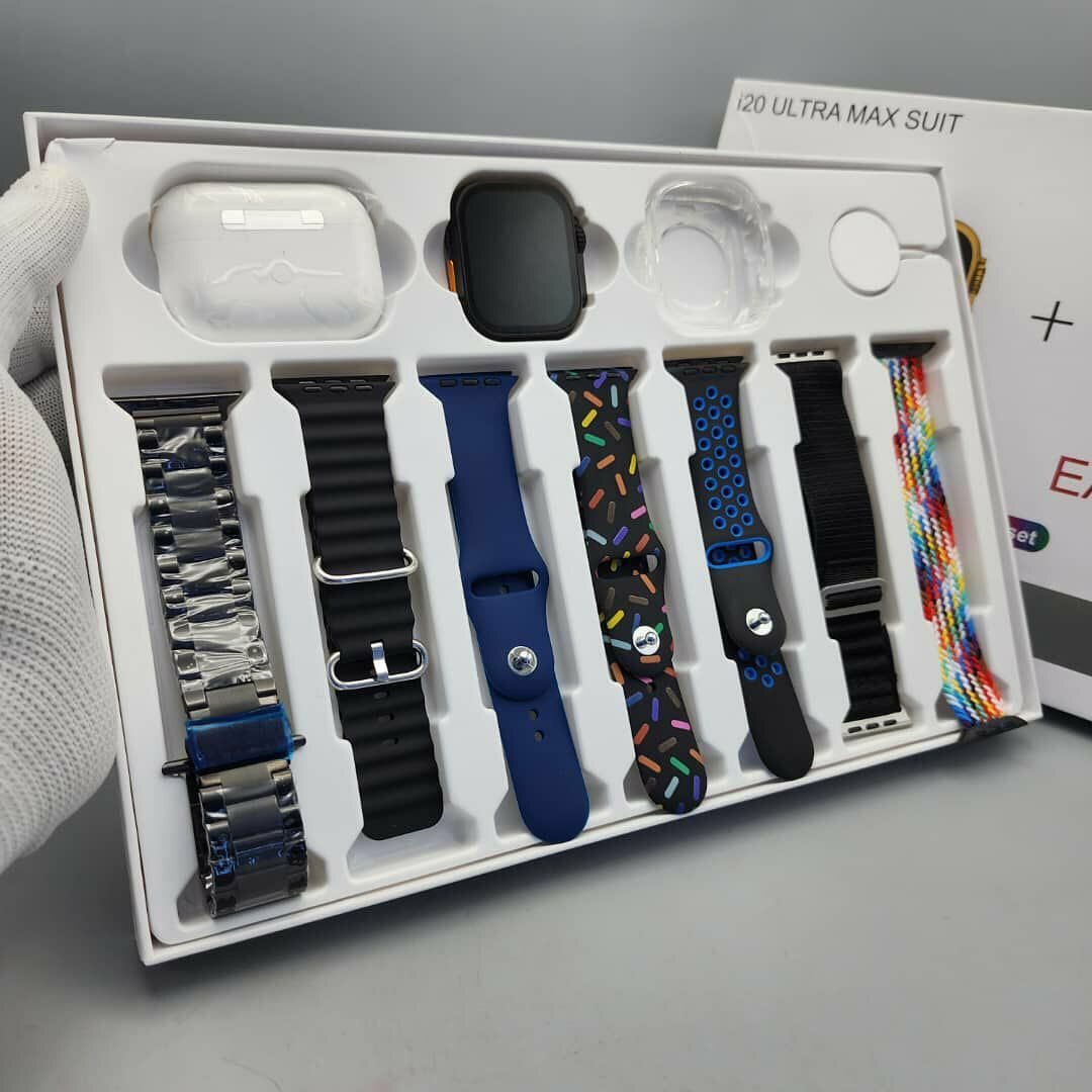 This smartwatch comes with extra 7 straps (wristbands) and an AirPod. It features includes, Games, ECG, call, calculator etc.