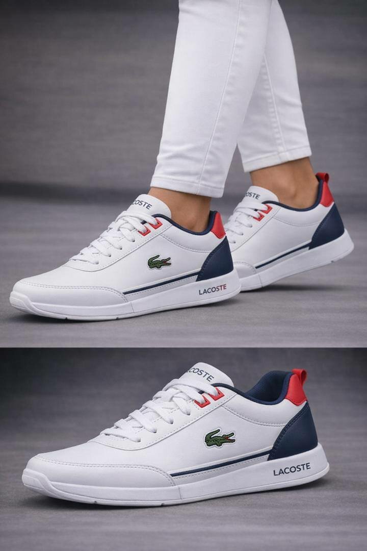 Découvrez ces élégants sneakers Lacoste pour homme, offrant confort et style avec leur design blanc épuré et détails bleu et rouge. Idéals pour des tenues casual ou sportives, ces chaussures sont parfaites pour un usage quotidien.