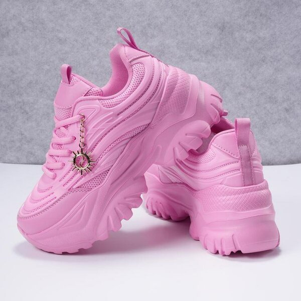 Sneakers roses avec semelle épaisse pour un look audacieux. Design tendance avec détail chaîne dorée. Parfaites pour les tenues décontractées et les sorties en ville.