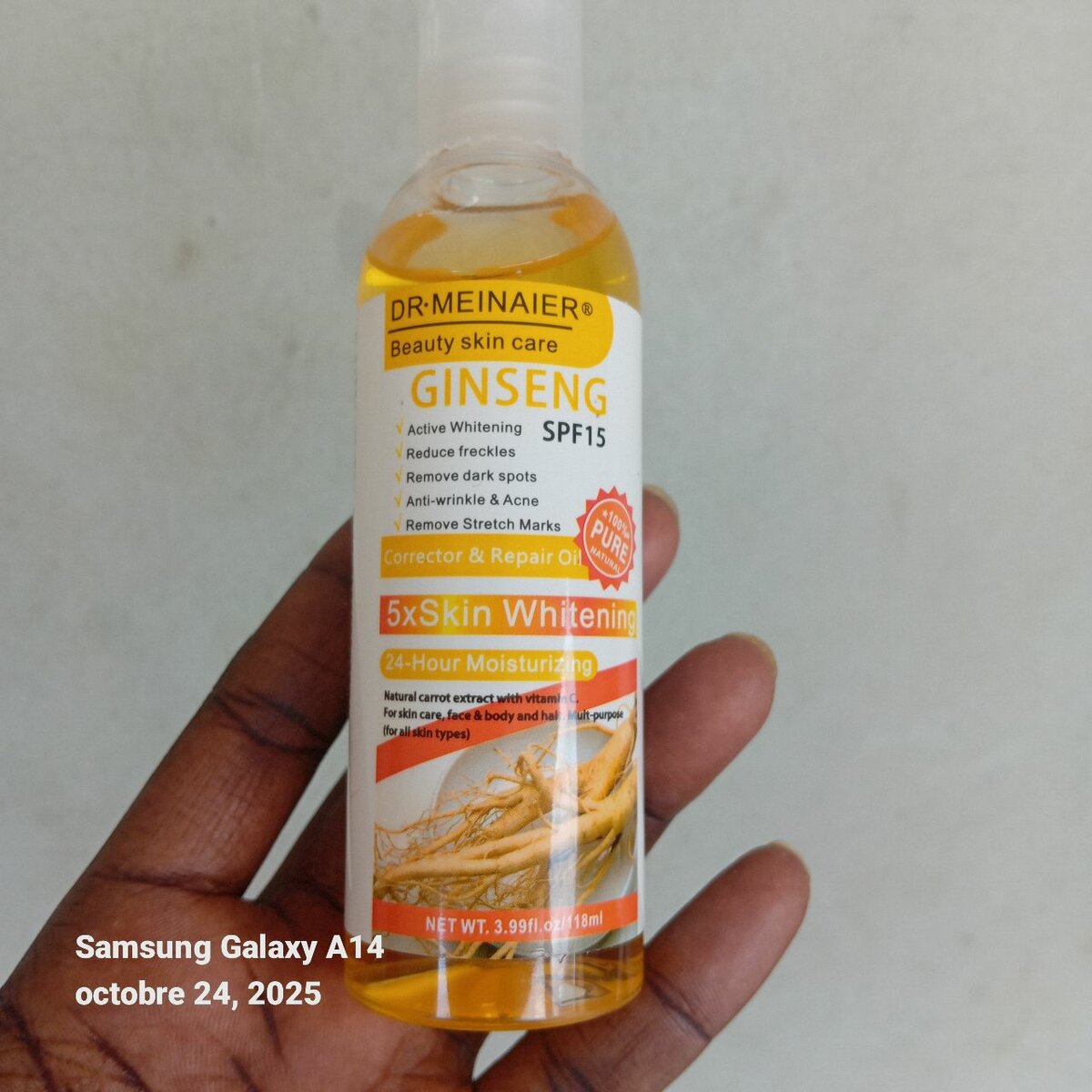 Découvrez notre soin corps et visage au ginseng, enrichi en actifs puissants pour réduire les taches et uniformiser le teint. Contient SPF15 pour une protection solaire. Idéal pour une peau lumineuse et hydratée toute la journée.