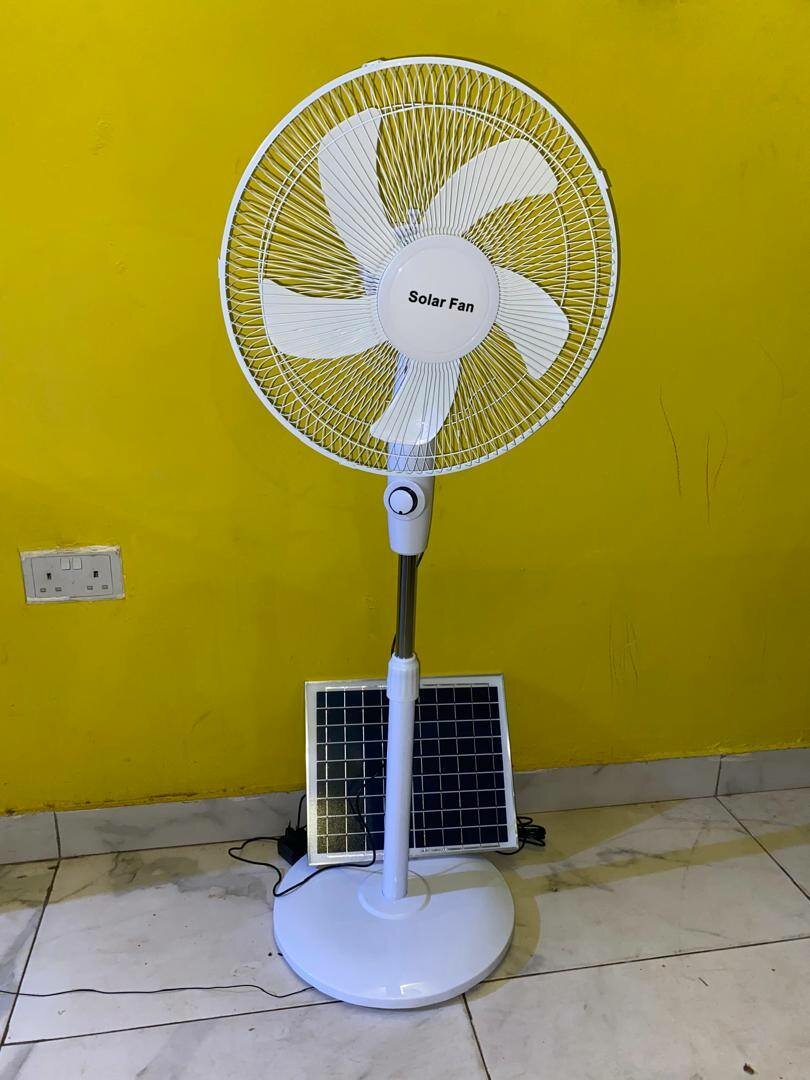 Solar fans with a solar panel and slot for electric charging