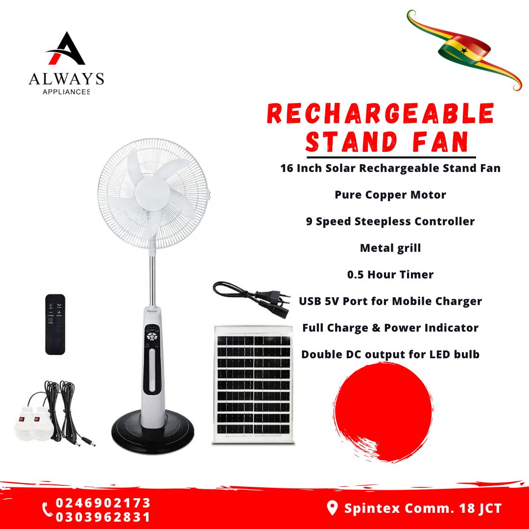 16 Inch Solar Rechargeable Stand Fan Pure Copper Motor 9 Speed Steepless Controller Metal grill 0.5 Hour Timer USB 5V Port for Mobile Charger Full Charge & Power Indicator Double DC output for LED bulb