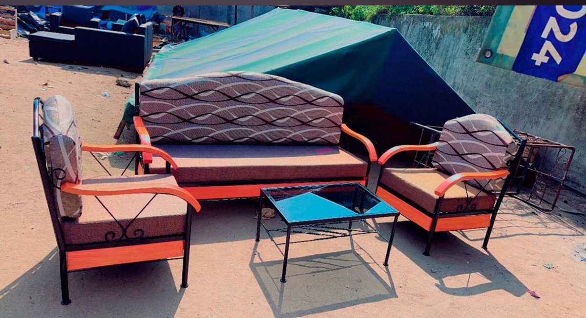 Salon en fer forgé de cinq places composé en divan de trois places , de deux fauteuils d'une place chacun et d'une table basse
