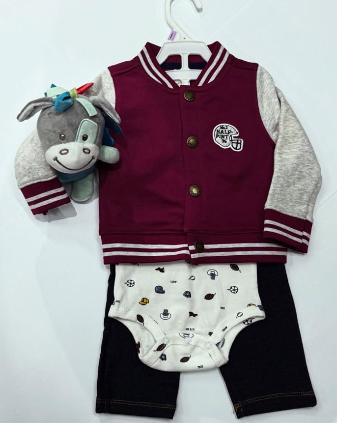 Очаровательный комплект для малыша, который сочетает комфорт и стиль! Бомбер в бордово-сером цвете с милыми нашивками добавит образу спортивного шарма, а боди с забавными принтами и удобные джинсы создадут уют и свободу движений. Такой лук подойдёт как для прогулок, так и для тёплых семейных встреч!