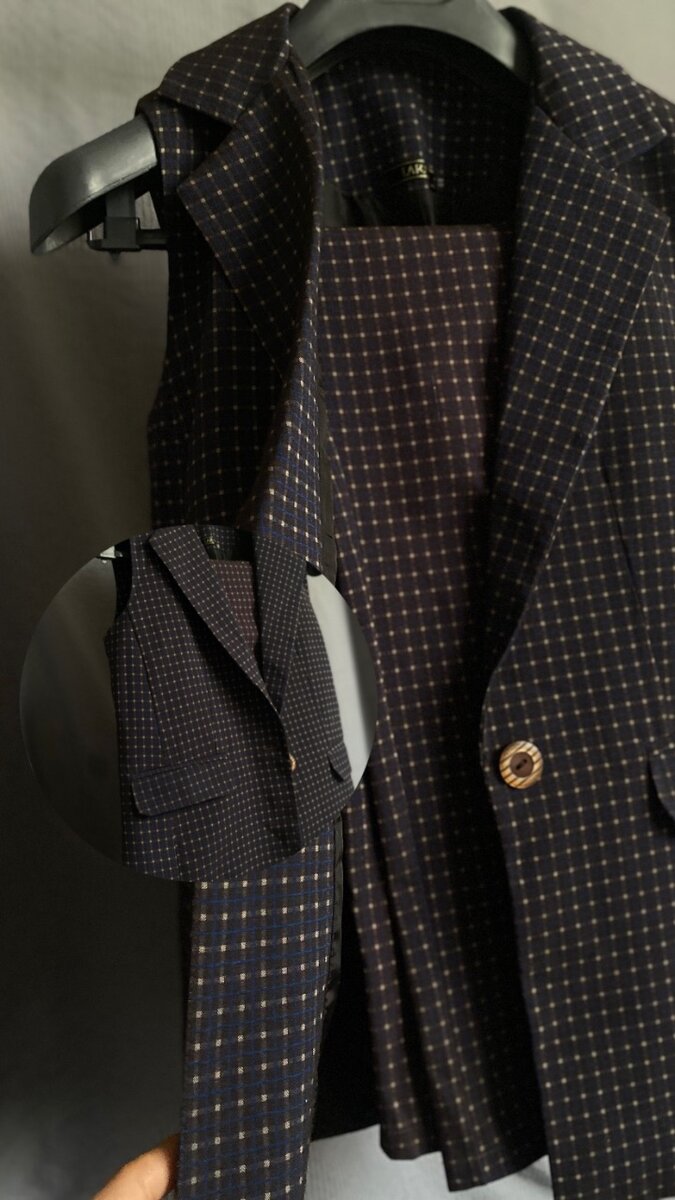 Продам костюм-двойку: жилетка + классические брюки.Цвет тёмно-синий в клетку с тёмно-коричневым, смотрится очень благородно и стильно.Фасон классический, хорошо сидит по фигуре.