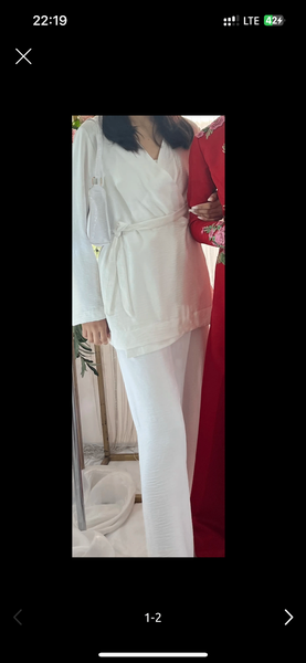 Асимметриялуу көйнөк жана галстук менен ак түстөгү аялдардын шым костюму