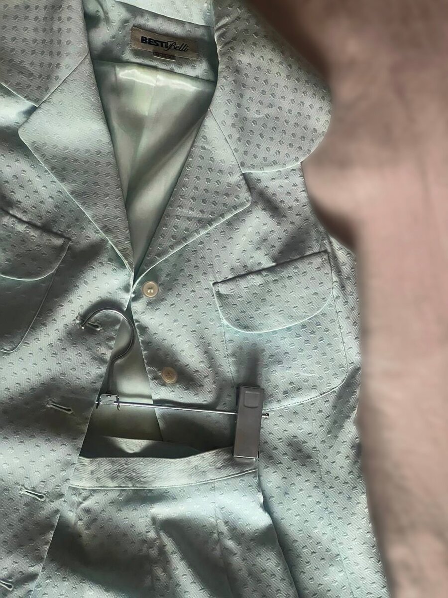Бирюзовый корейский костюм из лёгкой ткани. В комплекте элегантная блузка на пуговицах с отложным воротником и расклешённая юбка миди с изящными складками.