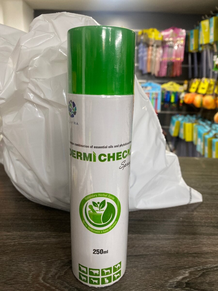 Spray Dermi Check 250ml - Formulé avec des huiles essentielles pour favoriser la cicatrisation naturelle, anti-inflammatoire et antiprurigineux. Repousse les insectes et soulage les irritations cutanées. Application facile et efficace pour divers problèmes dermatologiques. Idéal pour une utilisation domestique ou professionnelle afin de maintenir une peau saine et protégée de votre animal .