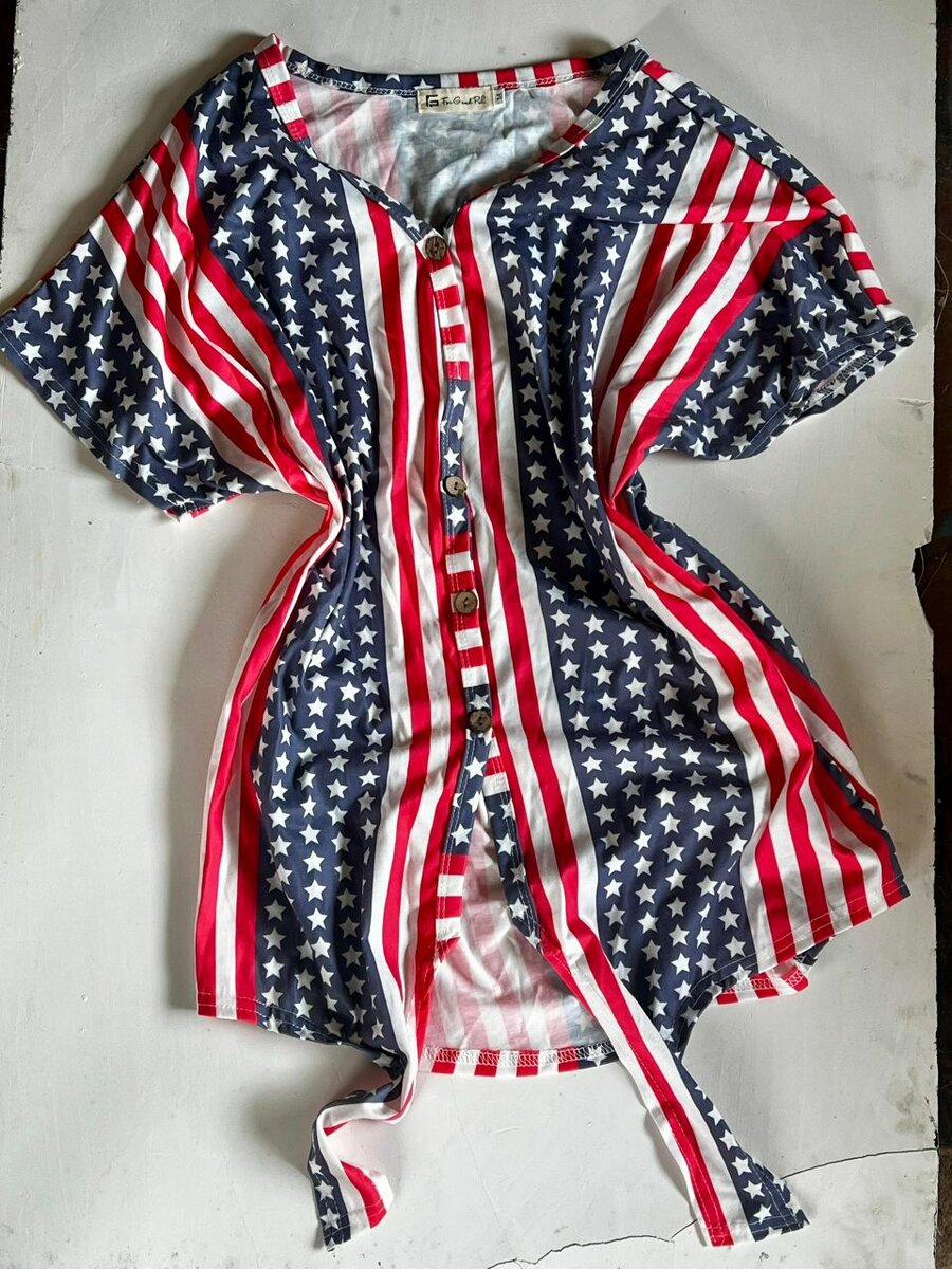 Patriotic women's tunic featuring iconic stars and stripes design. Lightweight and comfortable, perfect for casual outings, beach days, or festive occasions. Easy button-up style adds convenience and charm. Ideal for expressing your American pride with style.