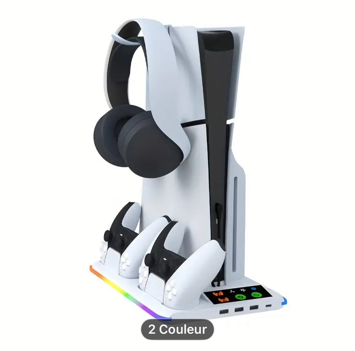 Optimisez votre expérience de jeu avec cette station de refroidissement multifonctionnelle pour PS5. Inclut des supports pour manettes et casque, avec éclairage LED pour un design moderne.
