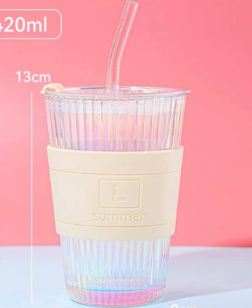 Iridescent Fashion Glass Tumbler with 3-in-1 Splash Proof Lid and Glass Straw