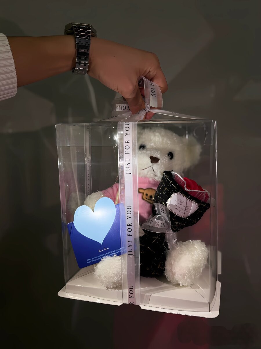 Очаровательный плюшевый мишка Тедди идеальный подарок для влюбленных! Мишка сидит с букетом мыльных цветов и упакован в прозрачную коробку с белоснежной атласной лентой и надписью "Just for you".