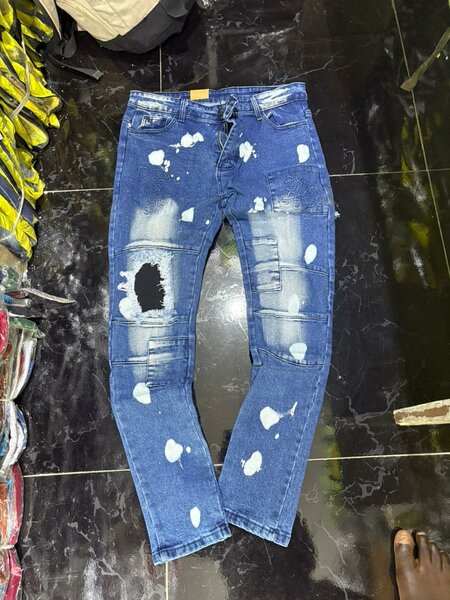 Stand out with these trendy distressed jeans featuring bold patches and ripped details. Perfect for casual outings or making a fashion statement. Made from durable denim, they offer comfort and style for everyday wear. Unisex design caters to all.