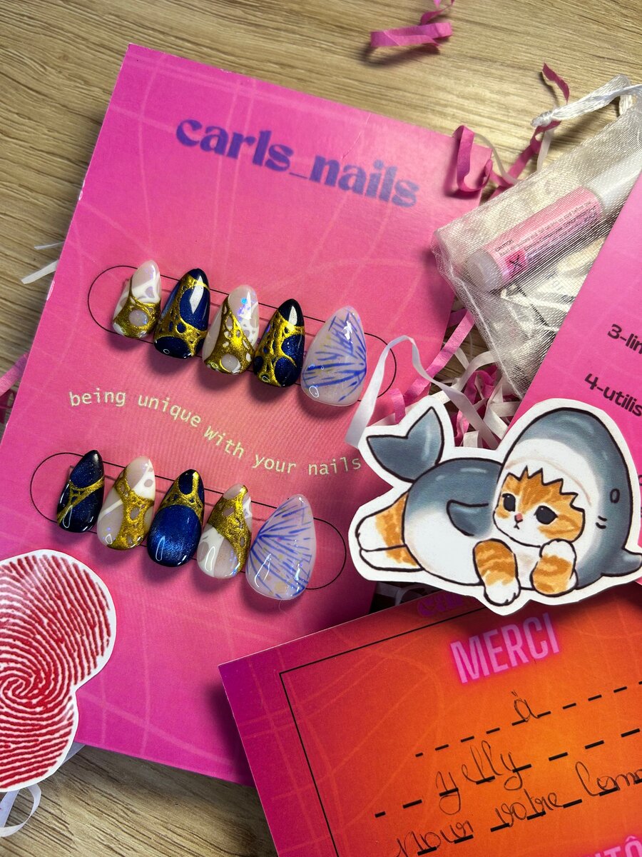 Ces press-on nails sont réutilisables , faits sur mesure et contient un kit de pose offert (2 colles, lime, alcool, repousse cuticules).