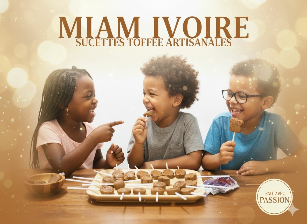 Découvrez les sucettes toffee artisanales Miam Ivoire. Une douceur exquise pour tous les âges, ces gourmandises sont idéales pour un moment sucré en famille. Fabriquées avec soin et passion, elles apportent une touche festive à tous vos événements. Parfaites pour les goûters d'anniversaire ou simplement pour se faire plaisir.