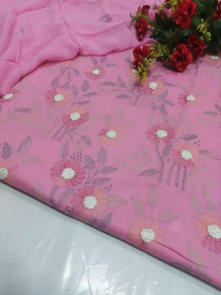 , Hand Made Lawn Embroidery wOrk 3 Pc sSuits Along With Chiffon Embroidered Dupatta Fabric : Lawn