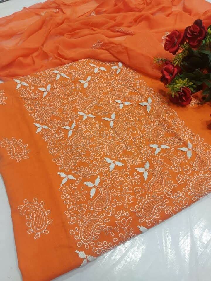 , Hand Made Lawn Embroidery wOrk 3 Pc sSuits Along With Chiffon Embroidered Dupatta Fabric : Lawn