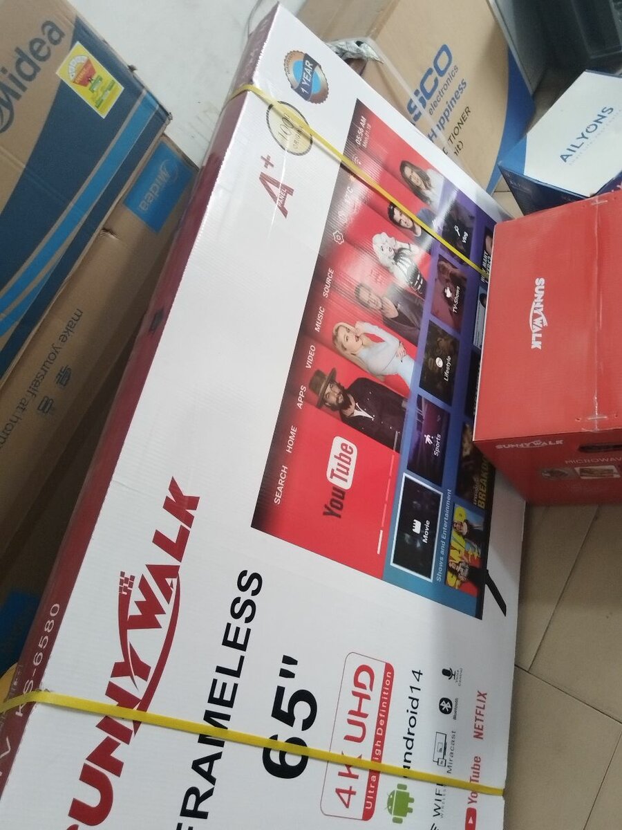 High quality sunny walk TV strong unique flame less 4k UHD smart android TV wifi USB hdmi wireless networks YouTube Netflix quality picture display resolution 2160pixels one years warranty