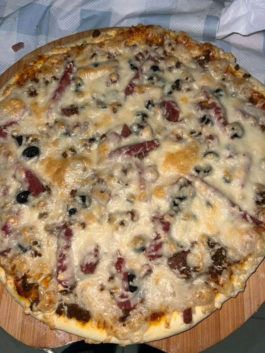 Découvrez notre pizza artisanale, généreusement garnie d'olives noires, fromage fondant et charcuterie savoureuse. Parfaite pour un repas convivial entre amis ou en famille. Profitez de la fusion de saveurs authentiques !