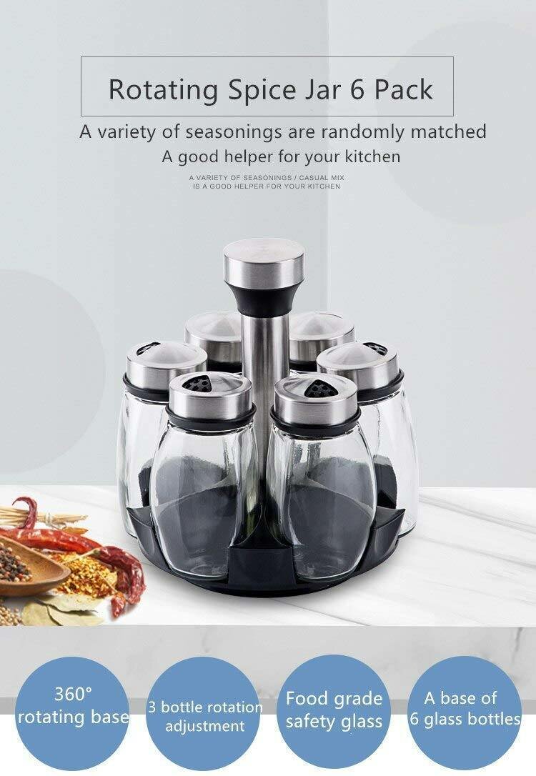 Optimisez votre cuisine avec ce support à épices rotatif à 360°. Comprend 6 bocaux en verre de qualité alimentaire pour garder vos épices fraîches. Idéal pour un accès facile et une organisation parfaite. Parfait pour les chefs à domicile et les amateurs de cuisine.