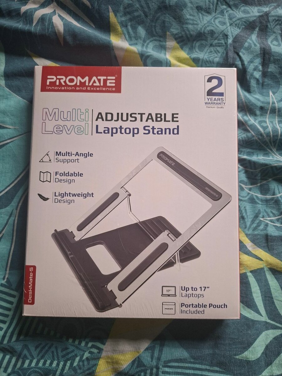 Optez pour le support de laptop ajustable Promate pour un meilleur confort. Sa conception pliable et légère convient aux ordinateurs jusqu'à 17 pouces. Idéal pour ajuster l'angle de vue, il est parfait pour le bureau ou en déplacement. Sac de transport inclus.