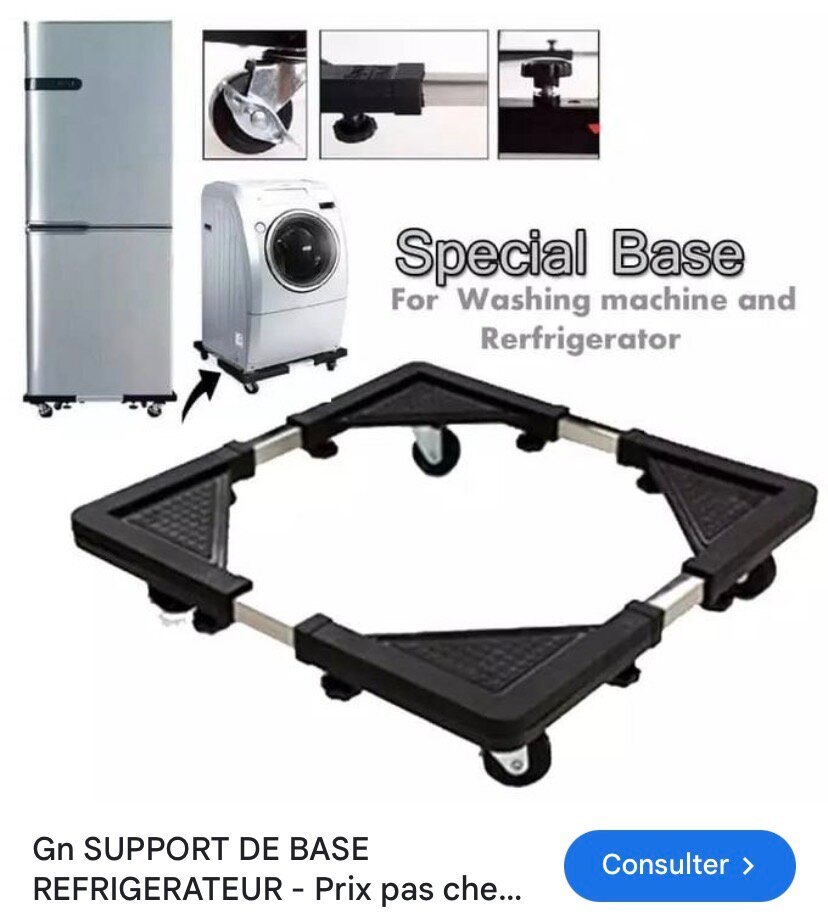 Support robuste et ajustable pour réfrigérateurs et machines à laver. Idéal pour faciliter le déplacement et l'entretien de vos appareils. Roues pivotantes pour une mobilité aisée. Choix parfait pour maison moderne !