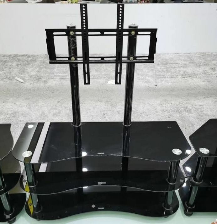 Découvrez ce support TV moderne avec étagères en verre trempé noir. Idéal pour toutes les tailles de TV, il offre stabilité et style chic à votre salon. Ses étagères vous permettent de ranger facilement vos appareils multimédia. Parfait pour un intérieur contemporain.