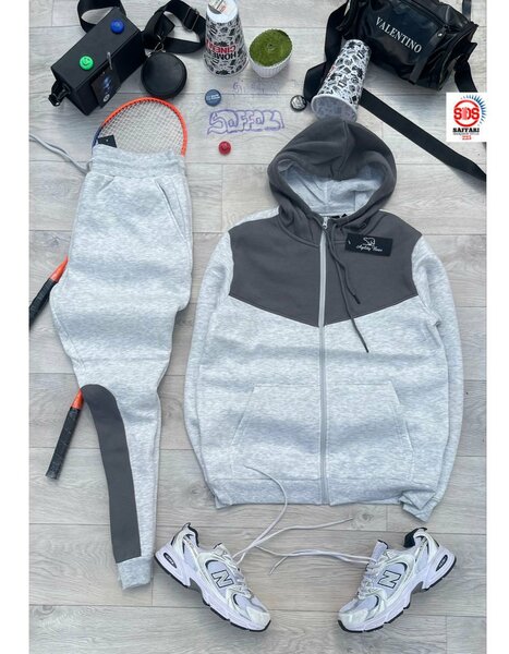 Ce survêtement à capuche gris allie confort et style pour les activités sportives ou les moments de détente. Fabriqué en matériau doux, il assure une grande liberté de mouvement. Parfait pour un look décontracté et sportif.