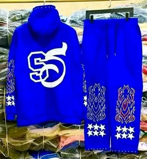 Découvrez ce survêtement bleu moderne, parfait pour un look sportif et audacieux. Avec des motifs flamboyants et des étoiles, il allie style et confort. Idéal pour le sport ou les sorties décontractées.