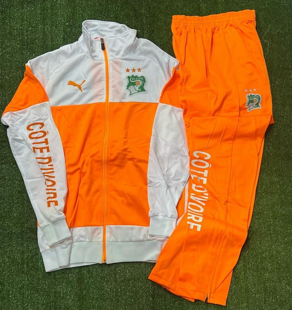 Impressionnant survêtement de l'équipe Côte d'Ivoire pour hommes. Conçu pour le confort et la performance, ce set inclut une veste et un pantalon assortis. Idéal pour les fans souhaitant afficher leur soutien lors des matchs ou dans la vie quotidienne. Le choix parfait pour les amateurs de football africain!
