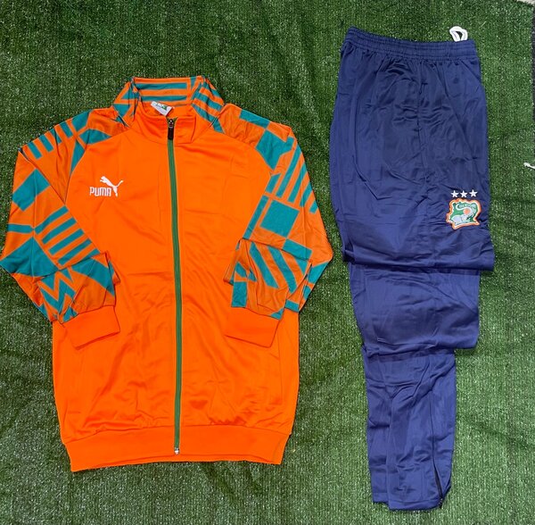 Survêtement de sport officiel de l'équipe de football de la Côte d'Ivoire, conçu par Puma. Idéal pour les fans et les sportifs, offrant confort et style moderne. Parfait pour l'entraînement et les sorties décontractées.