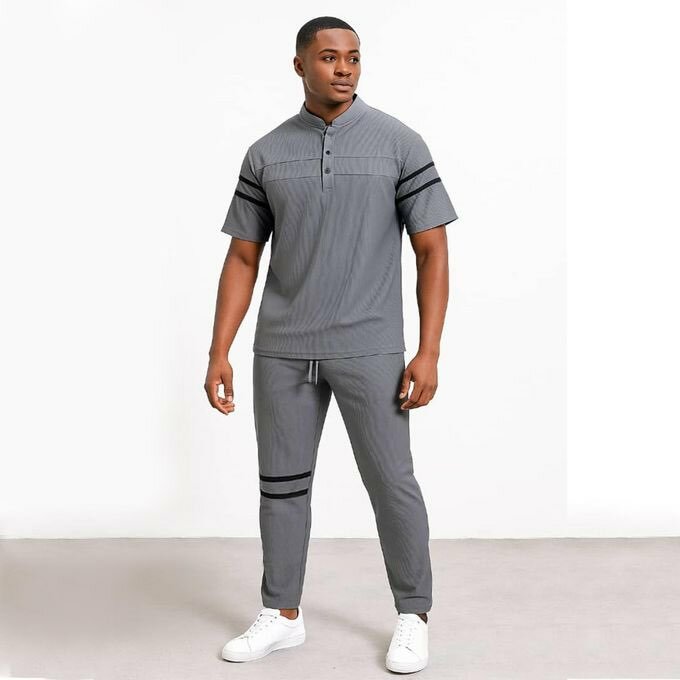 Ensemble de survêtement gris élégant composé d'une chemise à manches courtes et d'un pantalon assorti. Idéal pour les sorties décontractées ou pour se détendre à la maison. Coupe confortable, design épuré et détails à rayures. Idéal pour des looks modernes et tendance.