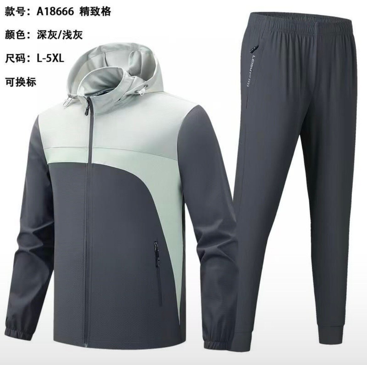 Optez pour ce survêtement élégant et fonctionnel, idéal pour le sport ou la détente. Fabriqué avec des matériaux résistants à l'eau, il vous garde au sec par tous les temps. Disponible en tailles L à 5XL, il convient à toutes les morphologies. Les couleurs gris foncé et clair apportent une touche moderne.