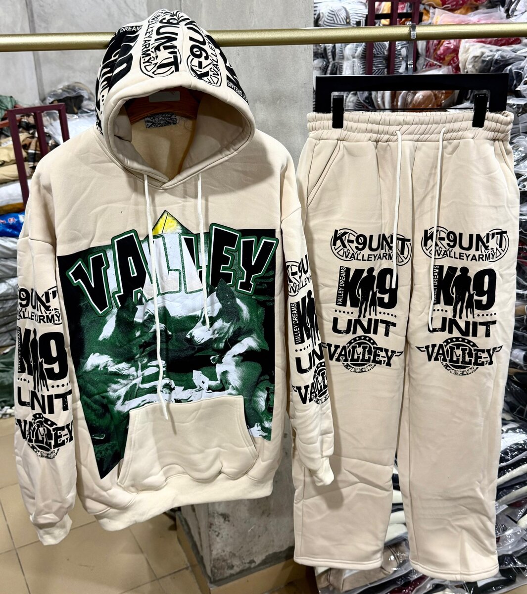 Découvrez ce survêtement tendance avec impression K9 Valley, parfait pour un look urbain. Disponible en plusieurs couleurs, ce set inclut un sweat à capuche confortable et un pantalon assorti. Idéal pour le sport ou les sorties décontractées, il vous offre un style unique et affirmé. Conçu pour durer, ce survêtement est l’addition parfaite à votre garde-robe.