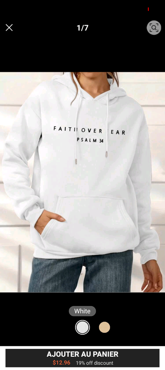 Confortable sweat à capuche blanc avec un message inspirant "Faith Over Fear - Psalm 34". Idéal pour un look décontracté et motivant.