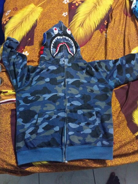 Sweat à capuche camouflage vert avec tête de requin imprimée sur la capuche. Idéal pour un look streetwear tendance.