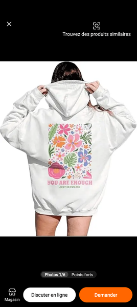 Ce sweat à capuche arbore un motif floral vibrant avec un message inspirant, parfait pour ajouter une touche de couleur et de positivité à votre garde-robe. Fait d'un matériau doux et confortable, il est idéal pour les sorties décontractées ou les moments de détente à la maison.