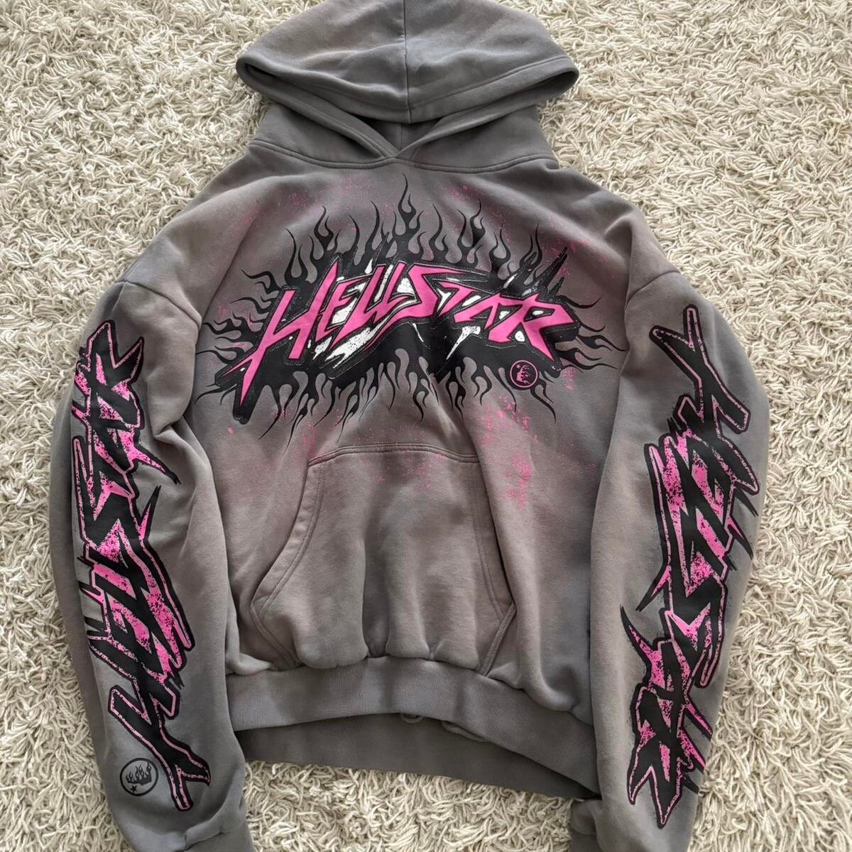 Sweat à capuche gris avec motifs roses et noirs Hellstar, parfait pour un look streetwear unique et stylé. Conçu pour les amateurs de mode urbaine.