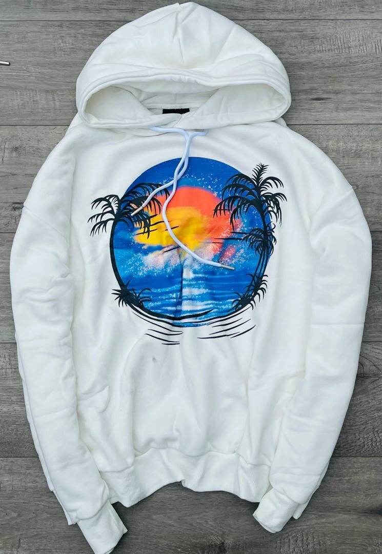 Découvrez ce sweat à capuche blanc avec un imprimé vibrant de plage au coucher du soleil. Confortable et parfait pour un style décontracté. Idéal pour les amateurs de mode et de voyages.