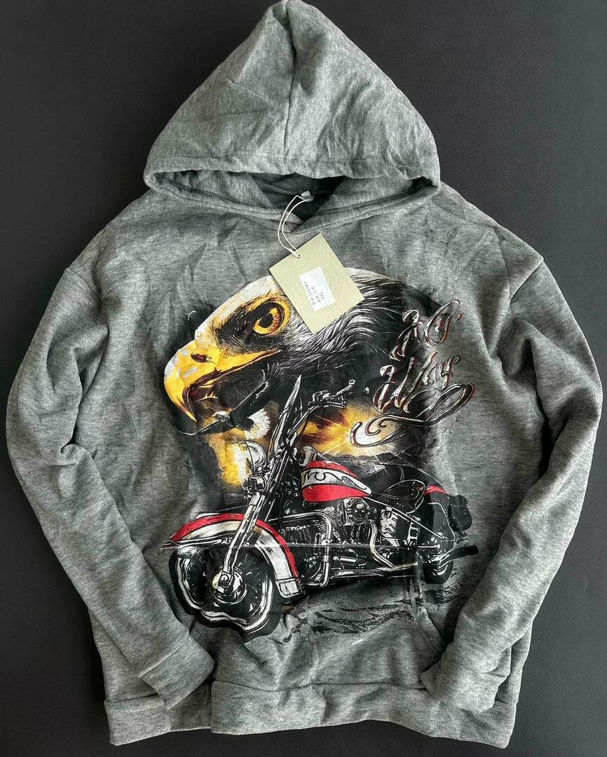 Découvrez notre sweat à capuche gris tendance avec design de moto et aigle. Confortable et idéal pour les amateurs de moto. Parfait pour un look décontracté tout en affirmant votre style unique. Fabriqué en matériaux de haute qualité pour une durabilité optimale. Idéal pour le quotidien ou les sorties.