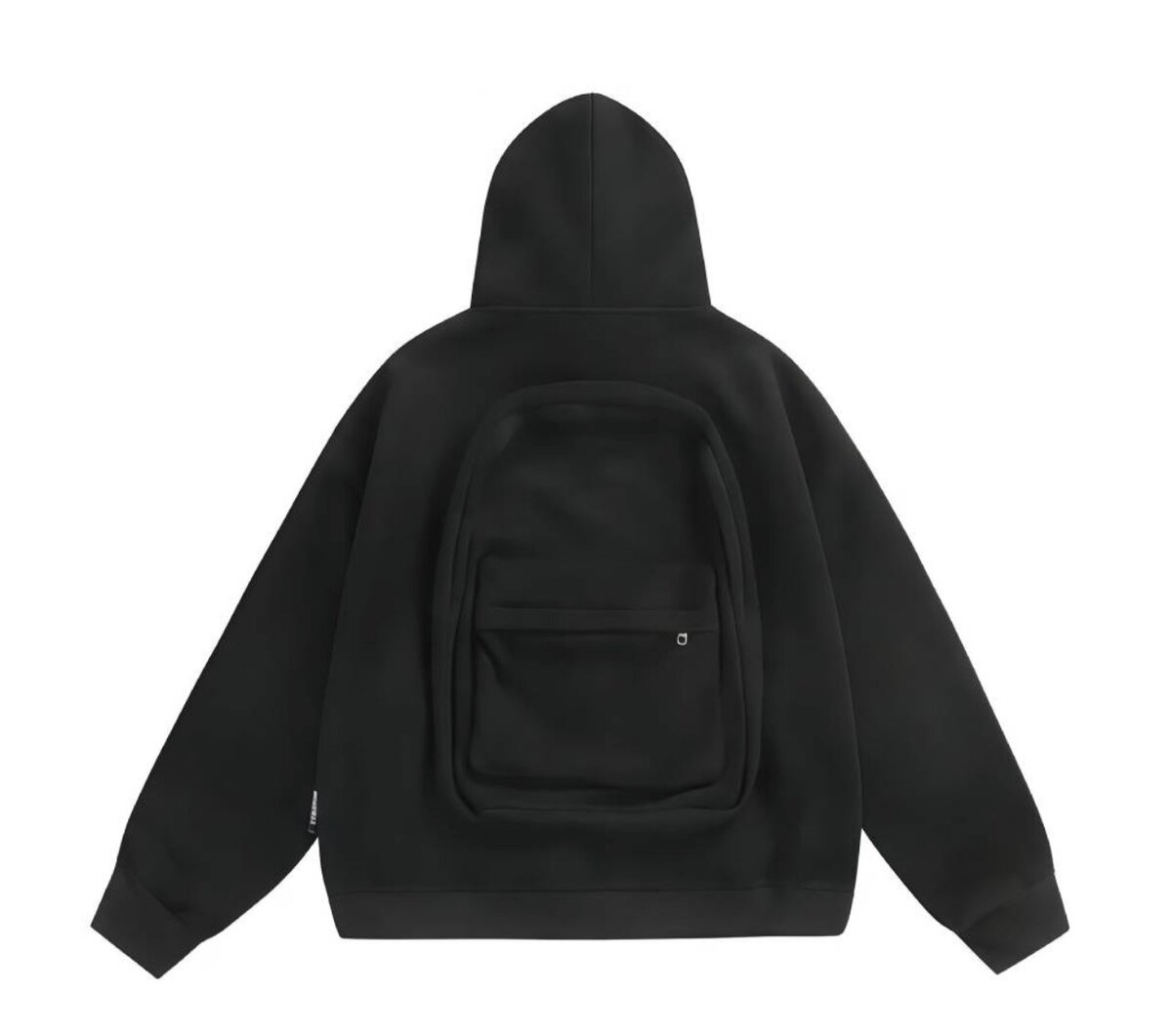 Sweat à capuche noir confortable avec poche intégrée pour sac à dos. Conçu pour un usage quotidien, idéal pour les loisirs ou les activités sportives.