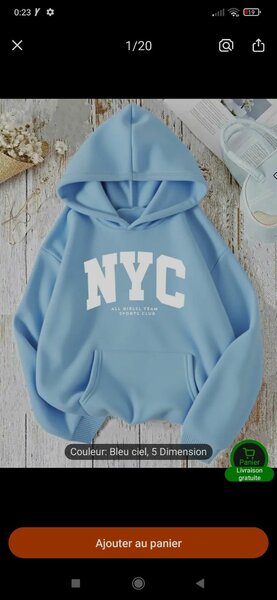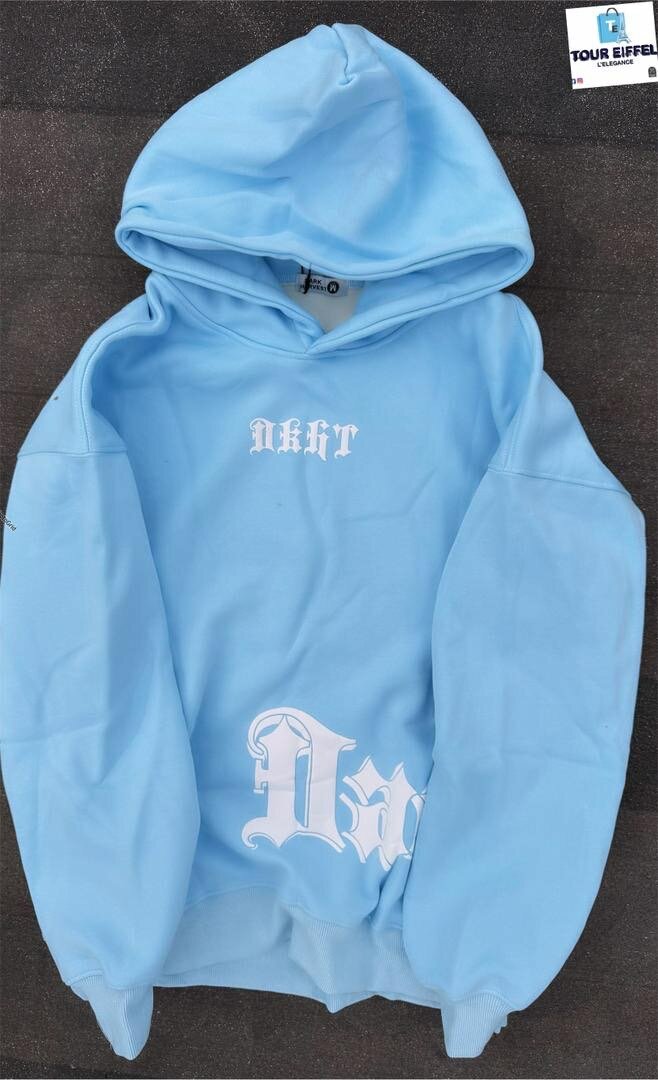 Hoodie en coton bleu clair avec imprimé élégant. Idéal pour un look décontracté et confortable. Parfait pour les journées fraîches et les sorties urbaines.