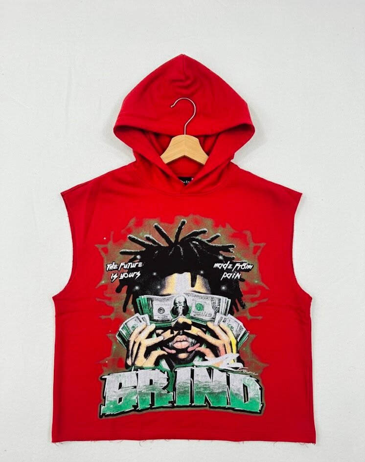 Sweat sans manches rouge avec un graphique avant impressionnant. Parfait pour les amateurs de mode streetwear.