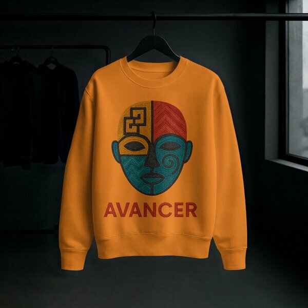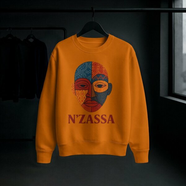 Sweat-shirt orange, N’ZASSA masque africain, grande taille, touche moderne et colorée. Idéal comme statement de personnalité.