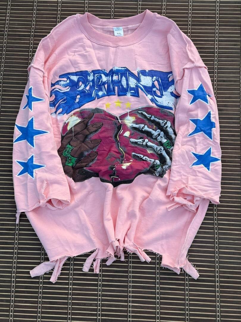 Découvre ce sweatshirt oversize rose avec design unique et franges. Parfait pour un look décontracté et stylé, idéal pour toutes les saisons. Ajoute une touche d'originalité à ta garde-robe!
