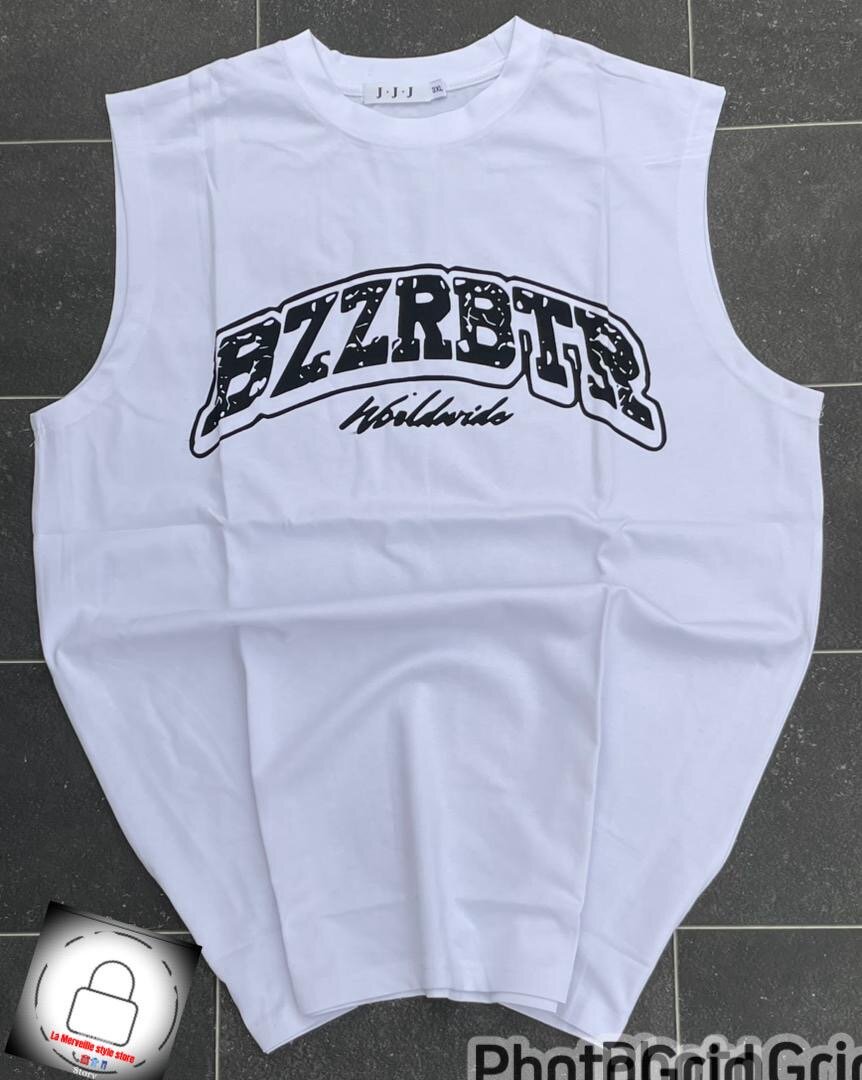Sweat-shirt sans manches blanc avec impression BZZRBTR. Confortable et tendance, idéal pour le sport ou les activités quotidiennes.